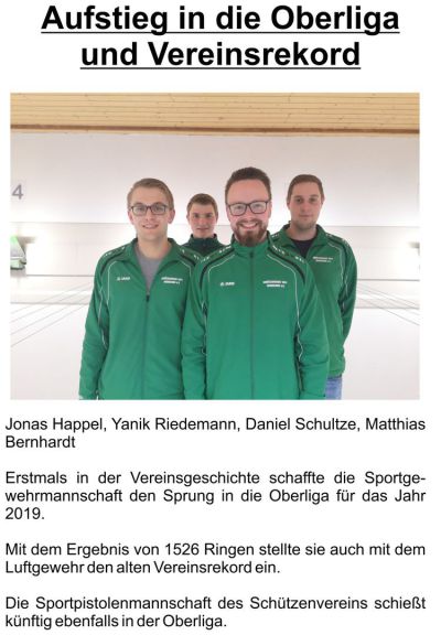 Tim Bergmann schoss in der Schülerklasse ein Topergebnis bei den Gaumeisterschaften in den Hallendisziplinen: er erzielte das Spitzenergebnis mit 29 Treffern mit der mehrschüssigen Luftpistole. Wie vom Biathlon bekannt, mussten Klappscheiben getroffen werden, nur eine von 30 blieb bei Tim stehen. In der Wettkampfklasse der U15 ist das ein neuer Rekord. Hervorgehoben wird diese Leistung durch den Abstand von 4 Ringen zum zweitplatzierten Favoriten im Wettbewerb, dem deutschen Vizemeister aus Lengers.