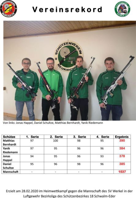 Neukirchens erste Luftgewehrmannschaft hat in 2011 die Schallmauer von 1500 Ringen mit einem Ergebnis von 1508 Ringen durchbrochen. Damit besteht ein neuer Vereinsrekord.